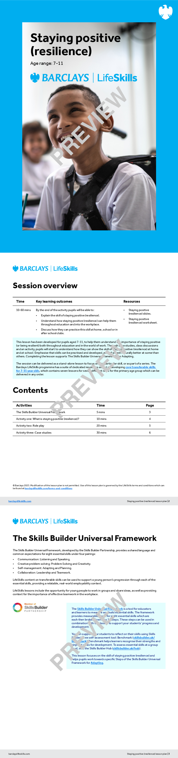 Through case studies, class discussions and a role play activity, this lesson encourages pupils aged 7 to 11 years to understand how they can show the skill of staying positive (resilience) at home and at school. By building a positive mindset, they become more confident in handling challenges and see setbacks as an opportunity to learn and grow.