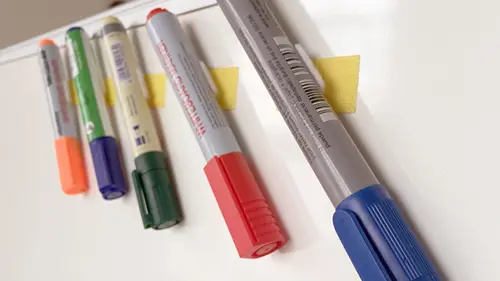Tired of reaching for whiteboard markers only to find them missing or annoyingly free of ink, Charlie, a teaching assistant hacked her classroom by using Velcro tape to stick her whiteboard makers to the top of the whiteboard. This keeps them out of her students’ reach, ensuring they don't get lost, and by keeping their nibs pointed down, they last longer.