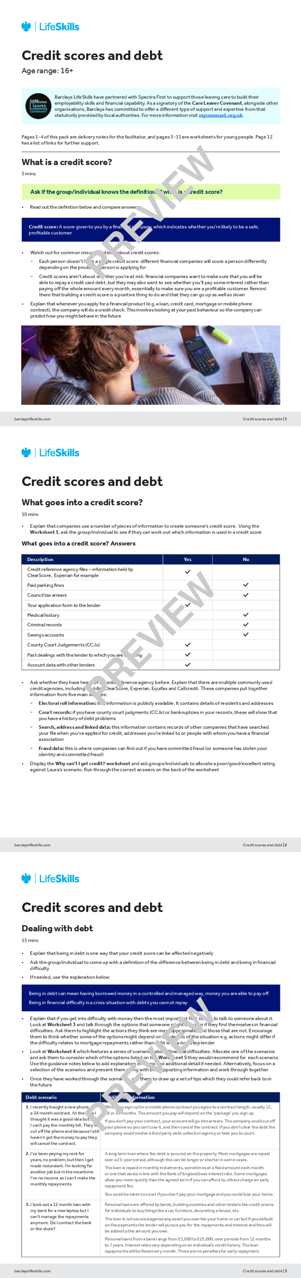 This activity pack helps young people understand what a credit score is and what affects it, before exploring practical ways of dealing with different types of debt. They’ll also look at a series of different scenarios related to debt and devise their own practical, relevant examples on how they would respond to these situations.