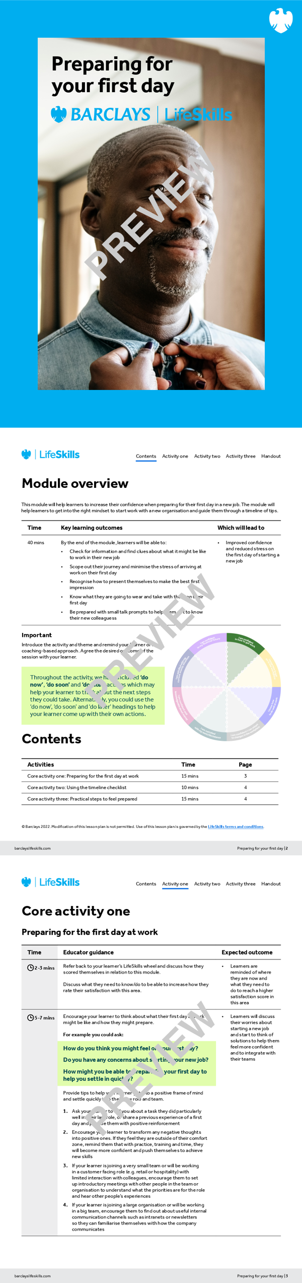 This module will help learners to increase their confidence when preparing for their first day in a new job. The module will help learners to get into the right mindset to start work with a new organisation and guide them through a timeline of tips.