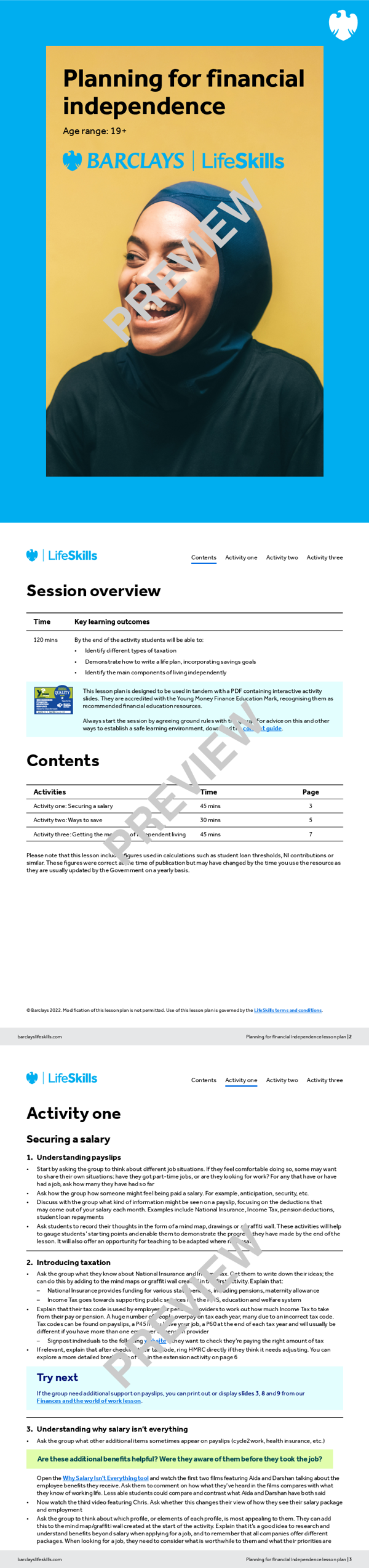 The Planning for financial independence lesson focuses on helping students feel more confident about living independently. It outlines different types of taxation and demonstrates how to write a life plan that incorporates saving goals.