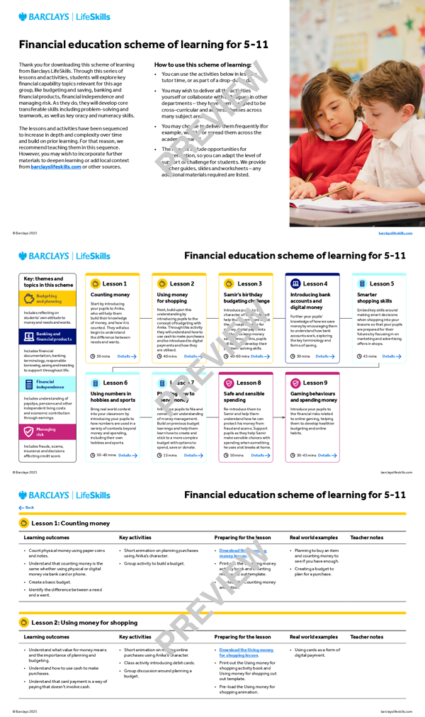 This scheme of learning covers a financial education learning sequence for students aged 5-11.
