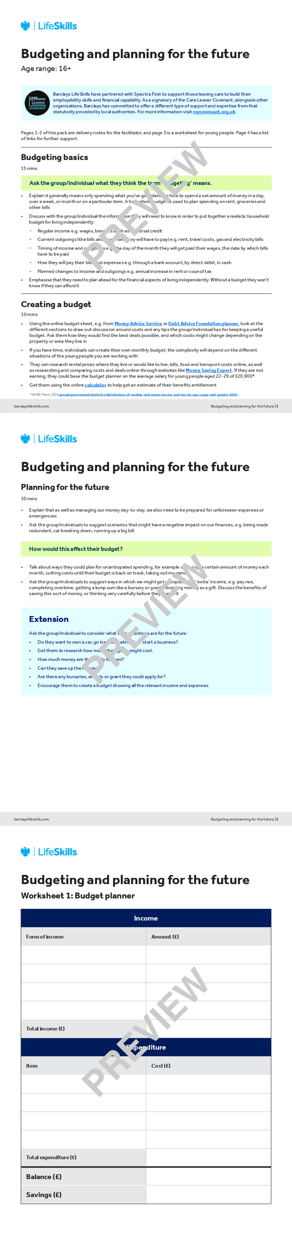 Activities include case studies, quizzes, discussions and practical tasks to build skills, knowledge and confidence, and can be delivered one-to-one or in a small group. Each pack includes guidance for support workers, worksheets for young people and useful signposting. Young people can register on LifeSkills to access further interactive resources on managing their money and building skills for the world of work here barclayslifeskills.com/young-people.