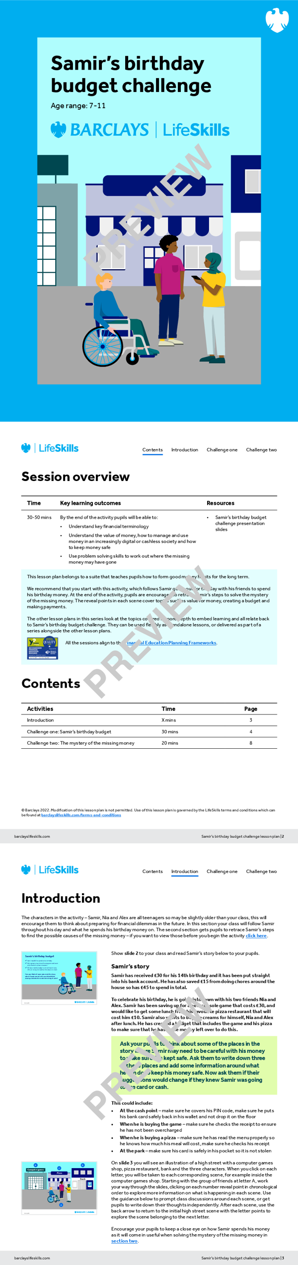 - Samir’s birthday budget challenge: Lesson plan – for use with a group of pupils in the classroom