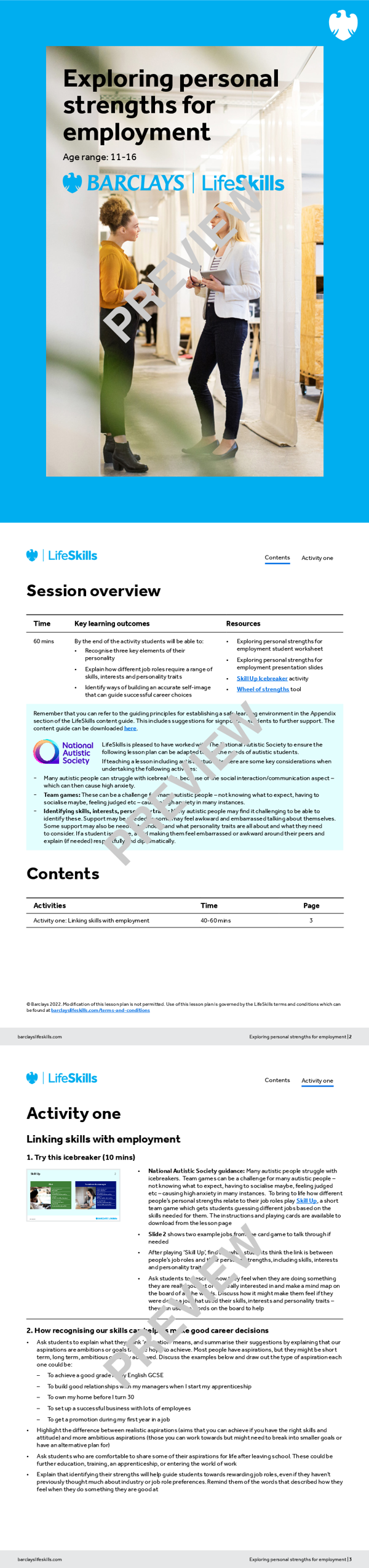 This lesson features in the employability skills scheme of learning for 14-16 year olds. They provide a ready-made sequence of curriculum linked resources to help you build progression in your learners' knowledge over time. Visit the Scheme of learning homepage to support with your planning.