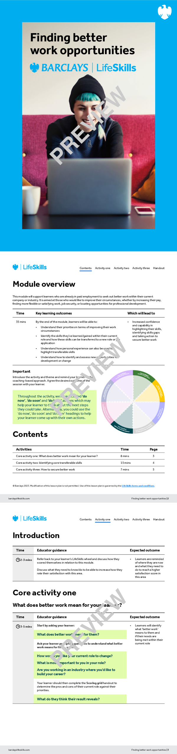This module will support learners who are in paid employment to seek out better work within their current company or industry, whether by increasing their pay, finding more flexible or satisfying work, job security, or locating opportunities for professional development.