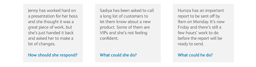 · How could the challenge become an opportunity? Could it be a chance to learn a new skill or get to know a colleague better by asking them for support?