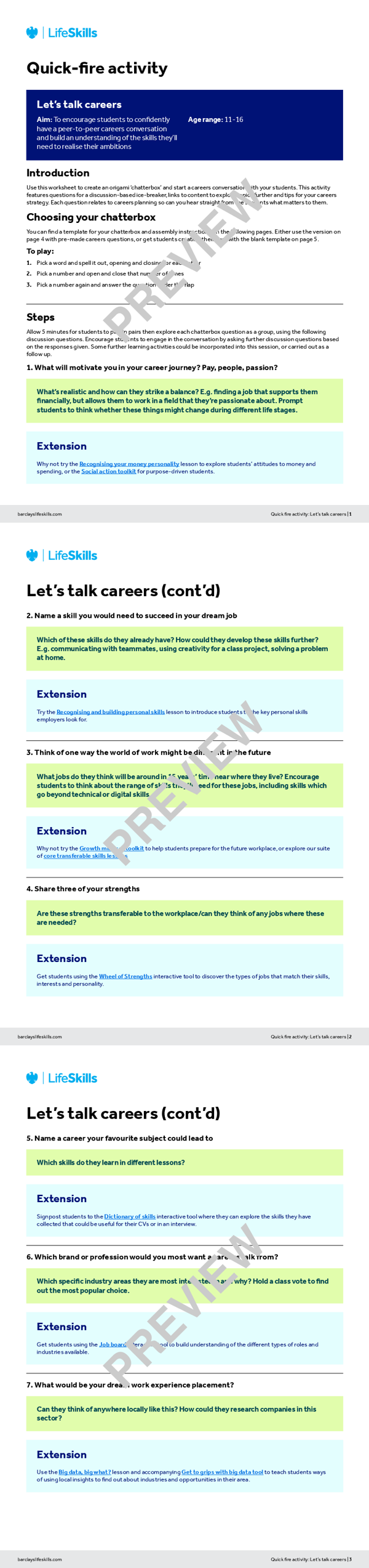 - Discussion questions to help you embed the chatterbox activity and careers conversations into an employability session*.