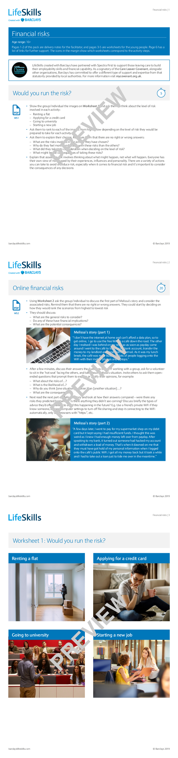 This activity pack helps young people understand the potential financial risks which could be involved in activities such as renting a flat, applying for a credit card, going to university and starting a new job. It presents participants with a real-life scenario where a threat to their financial security could occur, challenging them to think about how the advice they’d offer in these situations.