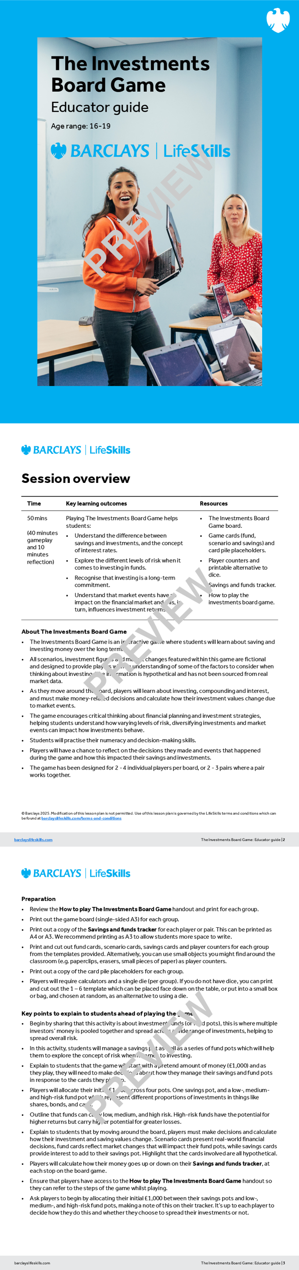 Task your students to make saving and investment decisions for pretend pots of money with our Investments Board Game. Through interactive game play they will learn about saving and investing money over the long term. Specifically, they will: