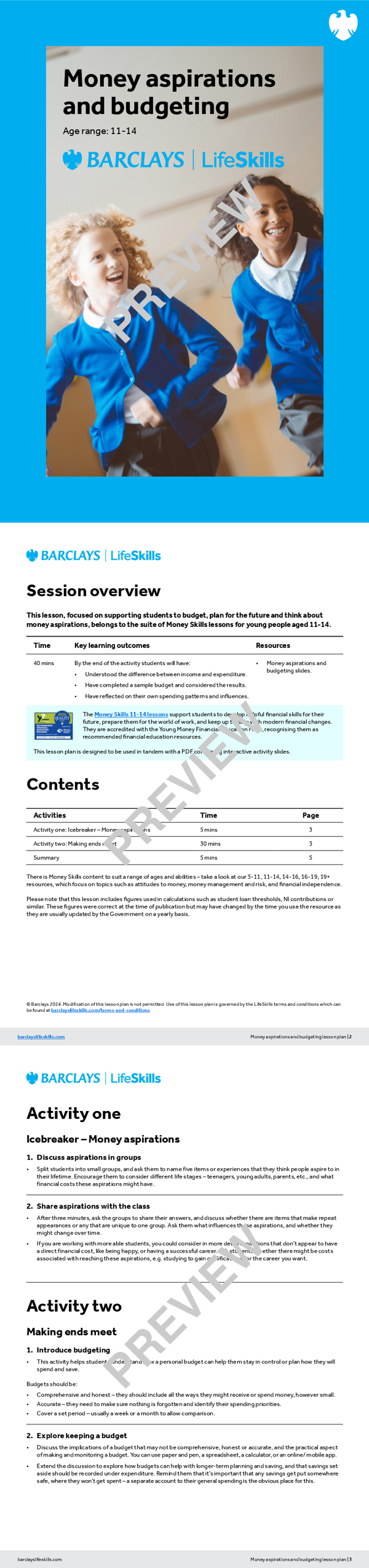 The Money aspirations and budgeting lesson focuses on reflecting on money aspirations with your students, before exploring the logistics of budgeting. They will learn how to keep and stick to a budget using case study examples as well as building their own budget.