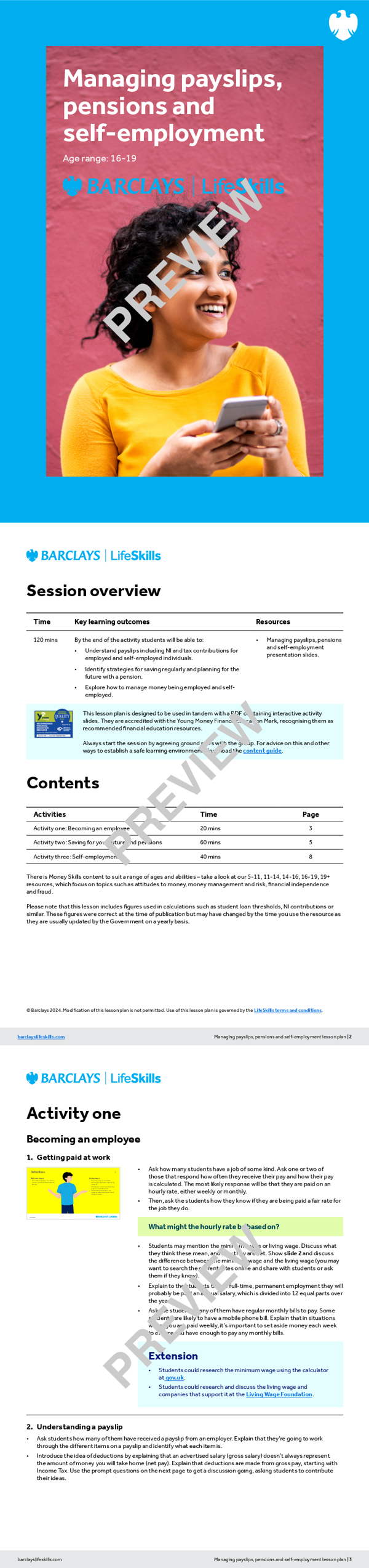 - Managing payslips, pensions and self-employment: Lesson plan - for use with a group of students in the classroom.