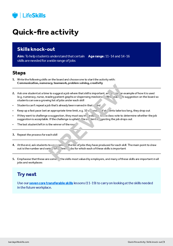 This quick-fire activity focuses on helping young people recognise the key skills sought after by employers and the wide variety of jobs for which each skill is important.